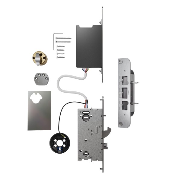 Yale Durus Basic komplekti kuuluvad: moodul (sees 4xAA patareid), lukukorpus SP R3, puurimiskaitse, lukukaabel, välimine lingiadapter lisavoolu andmiseks (USB-C kaabli jaoks), kruvid